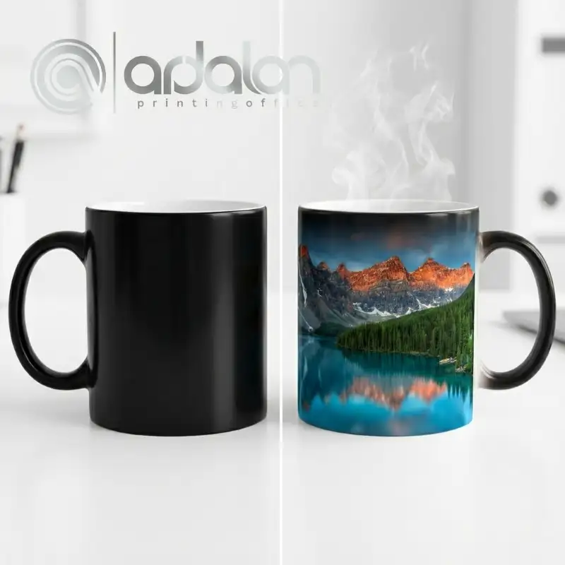 چاپ لیوان حرارتی یک ترفند جادویی برای هیجان زده کردن مخاطب است! این لیوان ها در حالت عادی کاملا مشکی هستند، اما وقتی چای یا قهوه داغ داخل آن می ریزید، تصویر چاپ شده به آرامی نمایان می شود.