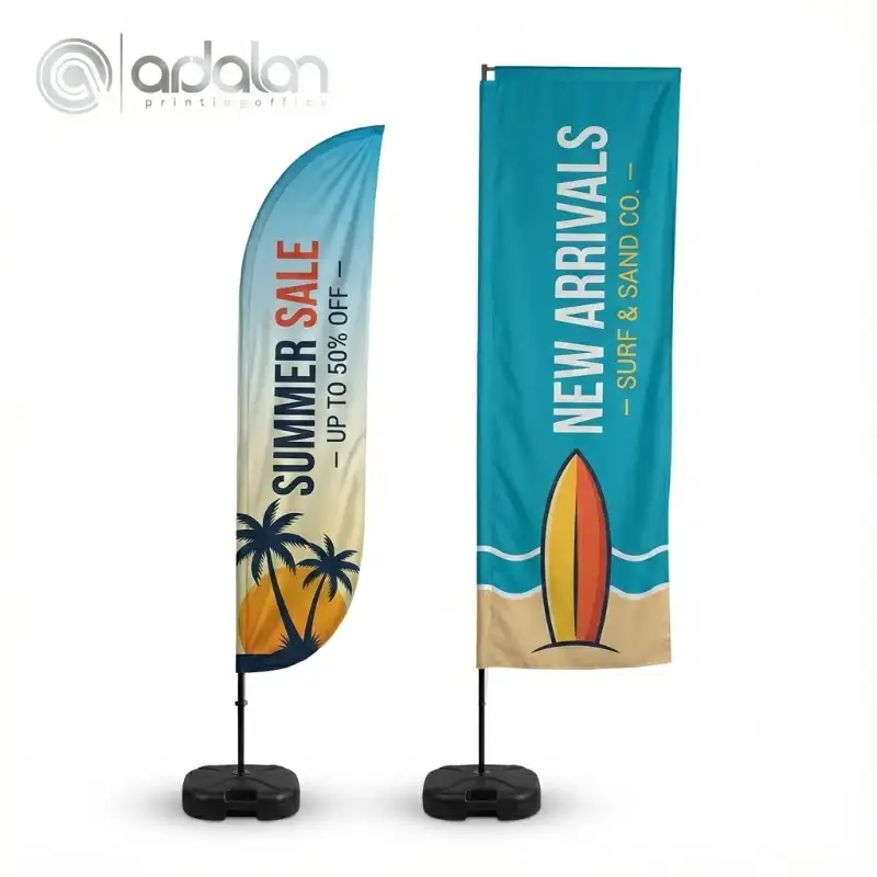 - تبلیغات محیطی: پرچم ساحلی (بادبانی و سامورایی) با پارچه راشل و پایه گرانولی.