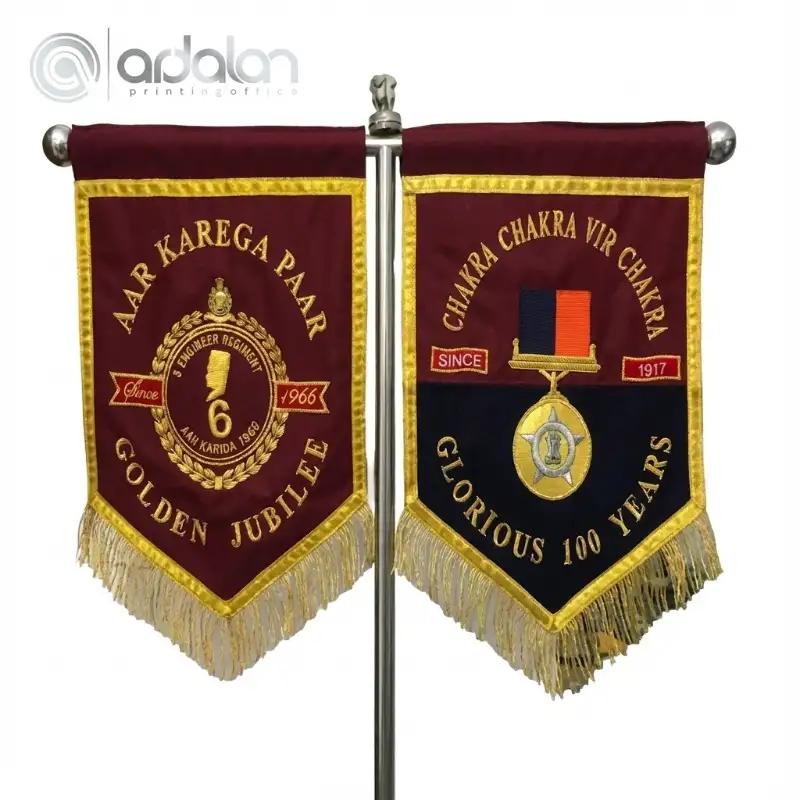 - طراحی: پرچم به صورت آویز از یک میله فلزی L شکل آویزان میشود.