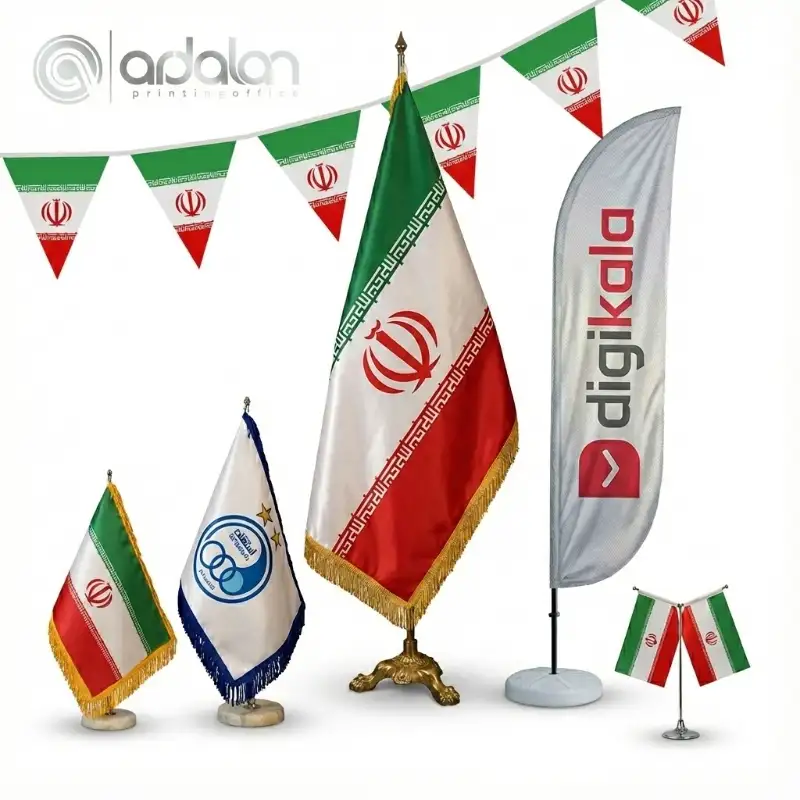 - ست اداری: پرچم تشریفات ایستاده و انواع پرچم رومیزی (L، T و کلاسیک).
